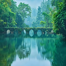 小七孔古桥——位于景区之首,景区之名由桥而得。这是一座小巧玲珑的七孔古石桥,桥长25米,桥面宽4米,拱高4米,建于清道光15(1836)年,昔为沟通荔波至广西的重要桥梁。桥由麻石条砌成,桥身爬满藤蔓和蕨类;古色古香的桥下是绿得令人心醉的涵碧潭。两岸古木参天,巨大的虬枝沿着桥伸臂,宛如巨伞撑在桥上。