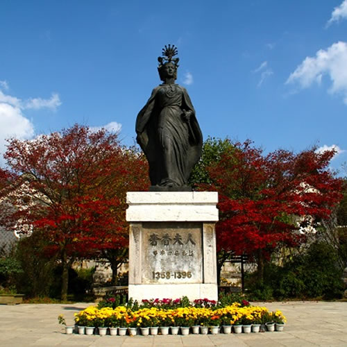奢香陵墓九层台,人龙文虎彝象开。墓葬坐北向南,左面有条“青龙”,乃是“万山环地拱,一岭向天撑”的云龙山登高放眼,层峦叠嶂,云雾缭绕,伟岸如海,会使人顿生胸襟宏阔,意兴高远的情怀;右边有条“活龙”,则是已经通车,川流不息的黔西北第一条高等级公路,由大方县城抵四川的纳溪,直接与长江水运相连的大纳公路。前有浪风台“驰逐于其南”,后有将军山,“坐镇于其北”。在四周山高林秀的风景映衬之中,更显示出奢香墓的建构布局,气势恢宏,肃穆庄重,岿然巨制。环围墓表的板柱、瓦筒、瓦当和护栏、华表等的浮雕、雕刻精细,刀法古朴,造型生动,智利健有力,全是形态各异的生龙活虎之象,鲜明地体现了彝族独特的传统文化内涵和艺术风格,具有较高的审美价值。
