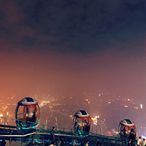 广州塔摩天轮位于广州塔顶455米高空处,是全球较高横向摩天轮,也是广州塔较受欢迎的游乐项目。新电视塔摩天轮由观光球舱、轨道系统、登舱平台、控制系统等构成,其中16个“水晶”观光球舱沿着倾斜的轨道运转,环绕一圈约为20分钟,每个观光球舱可容纳4-6名乘客;椭圆轨道平面与水平面成15°,为球舱装上了“调平机构”,16个球舱之间通过柔性索连接成环,在动力车的推动下作同步运转