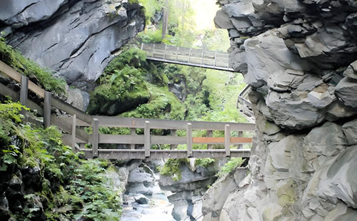 天生三桥地处仙女山南部,位居仙女山与武隆县之间。天龙桥即天生一桥,桥高200米,跨度300米,因其位居第一、顶天立地之势而得名。一桥桥中有洞,洞中生洞,洞如迷宫,既壮观又神奇。青龙桥即天生二桥,是垂直高差最大的一座天生桥。桥高350米,宽150米,跨度400米,夕阳西下,霞光万道,忽明忽暗,似一条真龙直上青天,故名青龙桥。黑龙桥即天生三桥,桥孔深黑暗,桥洞顶部岩石如一条黑龙藏身于此。黑龙桥景色以其流态各异的“三迭泉”、“一线泉”、“珍珠泉”、“雾泉”四眼宝泉而独具特色。