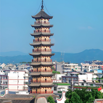 嘉祐寺塔 位于赣州市大余县南安镇东南隅水口山,该塔为楼阁式砖塔,五级六面,高19米,为单壁空筒式结构,没有基座。塔顶安覆盆,上置宝葫芦(1997年遭强台风折损)。各层出檐有小翘角和滴水勾头。该塔的额枋、斗拱与明人项子京“天籁阁”旧藏《宋名人画册》中“腾王阁图”中所绘的古建筑构件风格相似,留有唐代遗风。