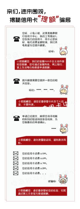 针对这种诈骗手段,招行信用卡通过微博、微信、掌上生活App、短信、电子账单等渠道,结合风险形态的变化,针对性开展交易欺诈安全宣传,提升持卡人风险识别及防范能力,强化用卡安全意识。招行信用卡还推出了防骗攻略和安全用卡小贴士。