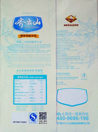 1.本外观设计产品的名称:包装袋(齐云山椰果南酸枣糕1);2.本外观设计产品的用途:本外观设计产品用于椰果南酸枣糕的外包装;3.本外观设计产品的设计要点:该包装袋的图案要素、色彩要素及其结合;4.最能表明本外观设计设计要点的图片或照片:主视图;5.省略视图:此外观设计产品为主视图与后视图的四边粘结而成,故省略其他视图;6.请求保护的外观设计:请求保护色彩。