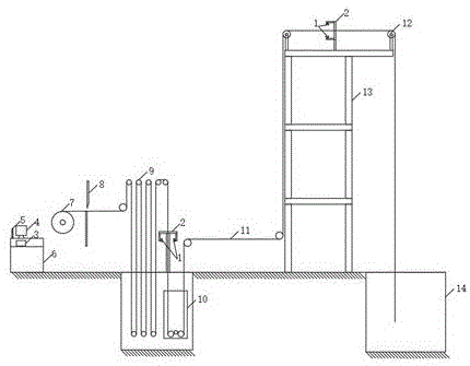 一种镀锌生产线收卷段在线监测装置,包含有摄像头(1)、支架(2)、控制器(3)、显示屏(4)和报警器(5);所述的控制器(3)、显示屏(4)和报警器(5)都设置在收卷操作台(6)上;所述的摄像头(1)、显示屏(4)和报警器(5)都通过电缆连接在控制器(3)上;其特征在于:所述的摄像头(1)共有两组,其中一组设置在塔台(13)上的转向辊(12)后,另一组设置在钝化烘箱(10)上方。本实用新型通过设置在塔台(13)上转向辊(12)后的摄像头(1)和钝化烘箱(10)上方的摄像头(1)来检测钢带(11)上是否黏附有锌渣等杂质和板面是否有凹坑;有效的避免鼓包废卷的产生。