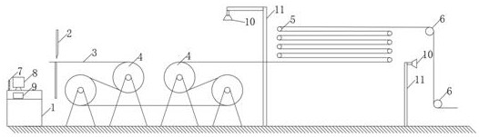 一种镀锌生产线开卷段在线监测装置,包含有摄像头(10)、支架(11)、控制器(9)、显示屏(8)和报警器(7);所述的控制器(9)、显示屏(8)和报警器(7)都设置在开卷操作台(1)上;所述的摄像头(10)、显示屏(8)和报警器(7)都通过电缆连接在控制器(9)上;其特征在于:所述的摄像头(10)共有两个,一个设置在第一组张紧辊(4)后;另一个设置在第一组纠偏辊(6)前。本实用新型通过设置在第一组张紧辊(4)后的摄像头(10)来检测钢带(3)边部是否有裂口;设置在第一组纠偏辊(6)前的摄像头(10)来检测钢带(3)是否跑偏;在降低工人劳动强度的同时有效的减少了断带事故的发生。