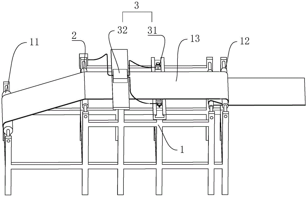 本实用新型公开了一种自动纠偏的钢带收卷机,涉及输送机械技术领域,旨在解决现有的收卷机在对钢带进行收卷的过程中难免会发生钢带发生位置偏移导致钢带滑脱的技术问题。其技术方案要点是包括机架、钢带、收卷机和张力机,收卷机设置在机架的一端,张力机设置在机架远离收卷机的一端,钢带设置在机架上。机架上设置有转向辊,转向辊靠近张力机的一侧设置有检测装置,检测装置包括设置在钢带两侧的距离传感器和信息处理装置,信息处理装置与转向辊电连接,距离传感器和钢带位于同一水平面上。达到了在钢带收卷过程中自动对钢带的位置进行检测,当钢带发生偏移的时候自动对钢带进行纠偏的效果。