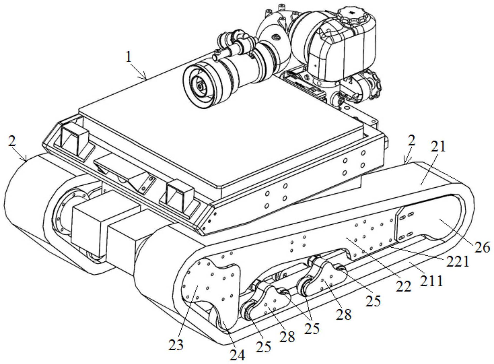 本发明公开了一种能攀爬越障的消防灭火机器人,包括消防灭火机器人本体和两个对称设置的履带行走机构,所述履带行走机构包括固定在消防灭火机器人本体底部的履带梁、位于履带梁前端的驱动轮、位于履带梁后端的张紧轮、位于驱动轮与张紧轮之间的固定式支重轮和浮动式支重轮,且固定式支重轮与浮动式支重轮和张紧轮处于同一接地平面上,固定式支重轮的重心与最后方浮动式支重轮的重心之间的距离占接地履带长度的40%~70%,履带围绕驱动轮、张紧轮、浮动式支重轮和固定式支重轮形成钝角朝上的钝角三角形结构,所述钝角的顶点为固定式支重轮,以及介于浮动式支重轮后部、张紧轮前部之间的履带梁悬空于接地履带。