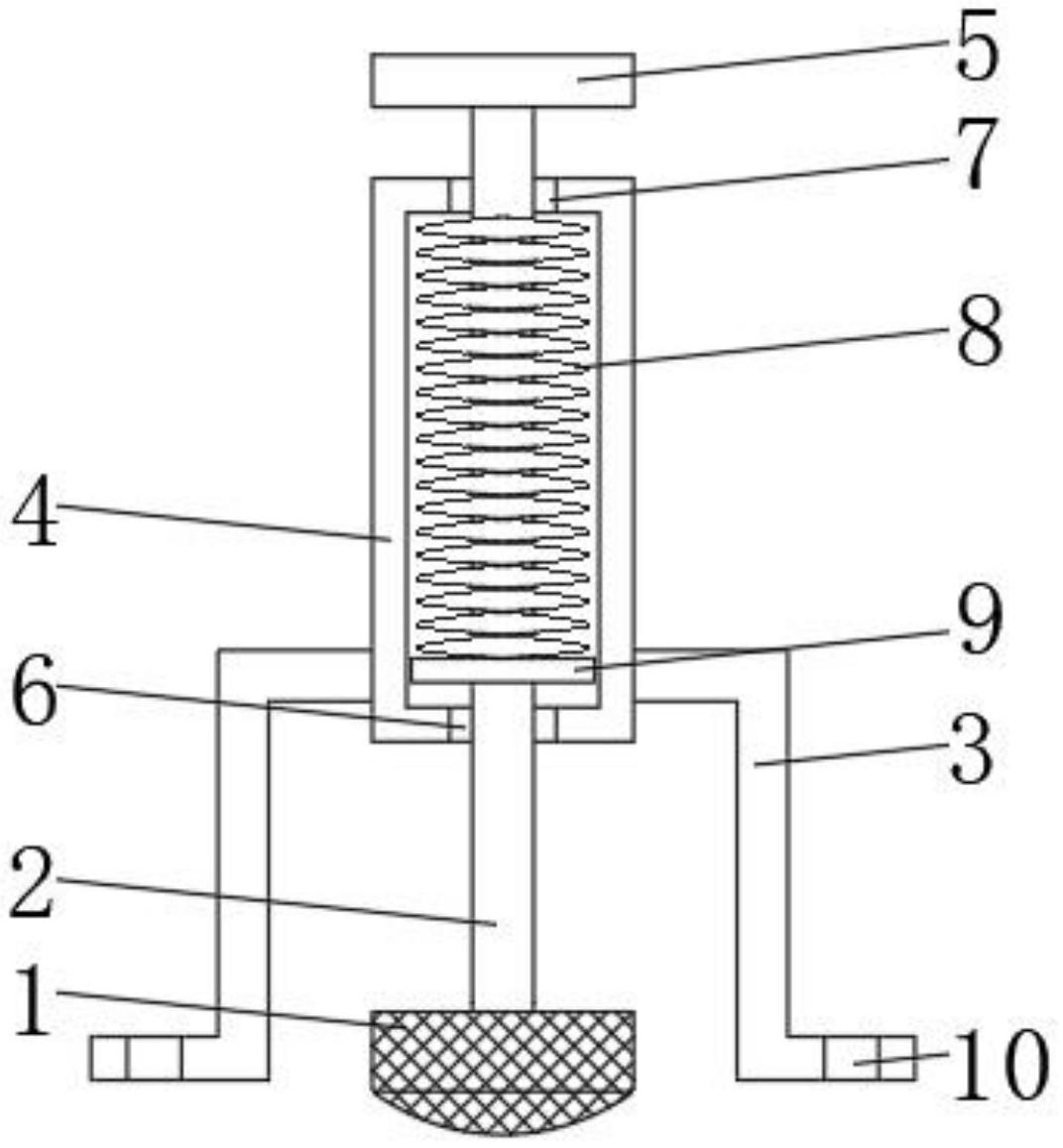 本实用新型涉及抗结皮装置技术领域,尤其涉及一种分解炉缩口抗结皮装置,其技术方案包括:橡胶头、连接杆、直角架、固定套、固定盘、第一插孔、第二插孔、弹簧、挡板和固定孔,所述固定套顶部开设有第二插孔,所述连接杆从第二插孔插入固定套内部,所述固定套内部活动安装有弹簧,所述连接杆穿过弹簧,所述连接杆插入固定套内部的一段安装有挡板,所述固定套底部开设有第一插孔,所述连接杆底部穿过第一插孔,所述连接杆底部安装有橡胶头,所述固定套两侧分别焊接有直角架。本实用新型具有结构简单,操作便捷,使用橡胶头对分解炉缩口处外侧冲击,将结皮震落,使用成本低,且不会对分解炉产生损坏的优点。