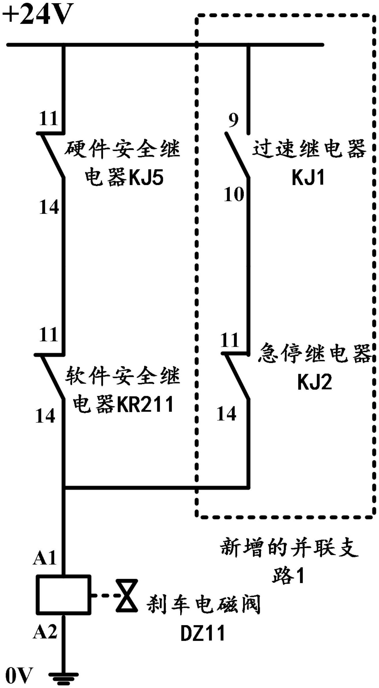 本实用新型提供了一种适用于风电机组的制动逻辑改造电路。该系统包括:硬件安全继电器触点11、14脚与软件安全继电器触点11、14脚串联后,与新增的并联支路1共同控制机组高速刹车电磁阀的通断;偏航制动继电器触点11、14脚与新增的并联支路2共同控制偏航制动电磁阀的通断;左偏航继电器触点11、14脚与新增的并联支路3并联后共同控制左偏航继电器线圈的得电和失电。本实用新型提供的一种适用于风电机组的制动逻辑改造电路在机组停机时优先投入空气制动,侧风偏航后备,机械刹车辅助,一定程度上避免了刹车系统过度投入导致的刹车系统摩擦起火,且最大限度的保证了机组在超速状态时转速的下降。
