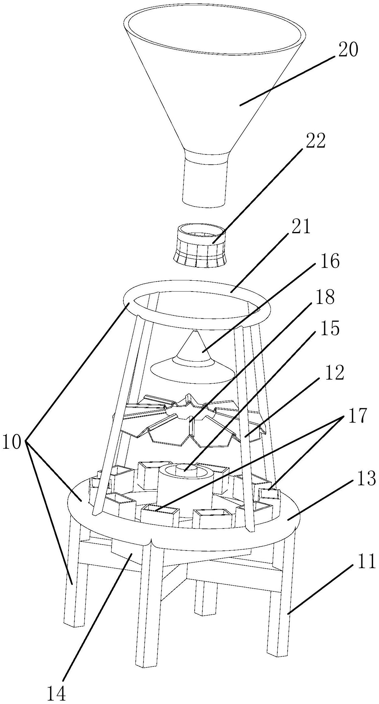 本实用新型属于药材包装设备技术领域,提供一种振动分药机,机架的内部安装一个振动器,振动器的输出轴连接一个呈锥形体状的振动盘,振动器驱动振动盘振动;机架上安装有若干接料器,振动器的外壳安装有若干分料器,分料器将药材送至接料器;机架的上部安装一个下料斗,下料斗的出料口抵近振动盘的锥形面安装,振动盘振动驱使下料斗出料并落入分料器;分药机机械替代人工分药,出料顺畅不堵塞,顺利完成分药,省时省力,降低人工成本,提升生产效率。