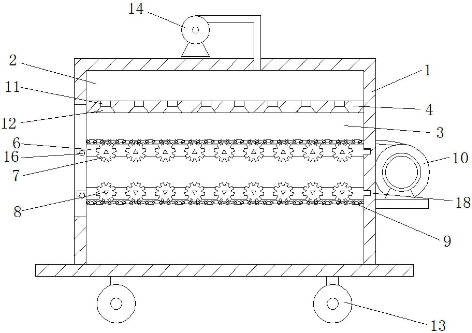 本实用新型涉及食品生产设备技术领域,尤其涉及一种冰糖葫芦生产设备;包括机体,所述机体包括至少一个送风室和加工室,所述送风室和所述加工室之间设有导流板,所述导流板上设有导流孔;所述加工室内设有至少一个可拆卸加工架,所述加工架上设有至少一组旋转夹持齿轮,各组旋转夹持齿轮包括并排设置的两个旋转夹持齿轮,各个旋转夹持齿轮的中心处设有夹持孔,其中一个所述旋转夹持齿轮通过传动链与驱动电机连接;所述导流孔与各组旋转夹持齿轮位置对应设置。本实用新型所公开的冰糖葫芦生产设备,由于设置了导流孔和旋转夹持齿轮,使得冷却风能够均匀地作用于糖浆的表面,使得糖葫芦的外观质量更加好,同时,提高了生产效率,提高了自动化程度。