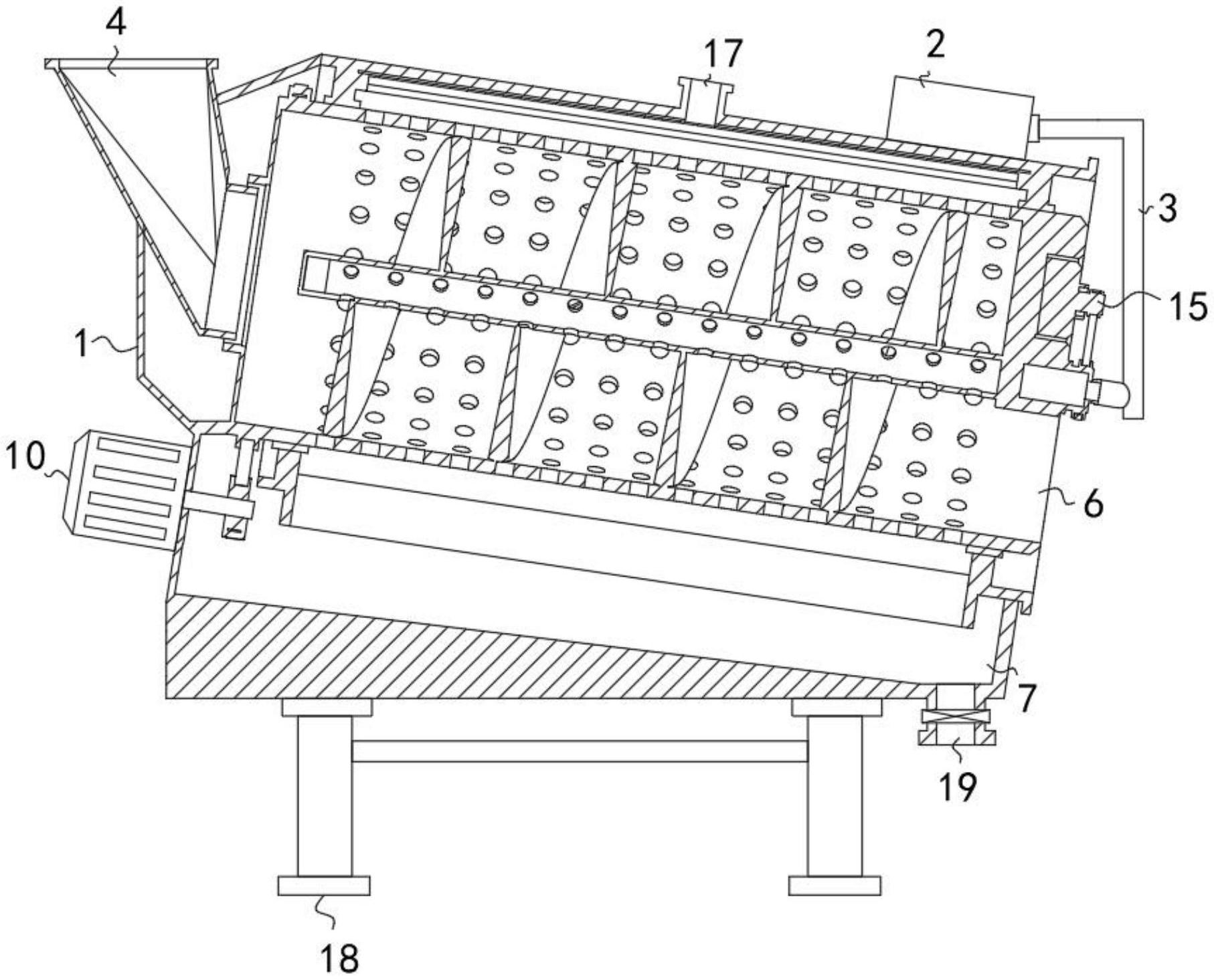 本实用新型公开了一种鸭肉加工用快干装置,涉及鸭肉加工技术领域。本实用新型包括壳体;壳体顶面固定连接有热风发生组件;热风发生组件出风口的一端固定连通有分风管;壳体一表面固定安装有进料管;壳体内表面之间固定连接有两支撑环;两支撑环内表面之间通过轴承转动连接有甩水桶;进料管一端与甩水桶转动连通;壳体内部且对应甩水桶下方的位置固定开设有与甩水桶连通的储废池;甩水桶尾部固定开设有排料孔。本实用新型通过甩水桶、螺旋输料叶片的设计,能够批量完成鸭肉的快干作业,且该装置变传统的物理脱水模式为离心脱水和再烘干模式,通过模式的转换,能够有效提升鸭肉的快干速率,增强鸭肉的快干效果。