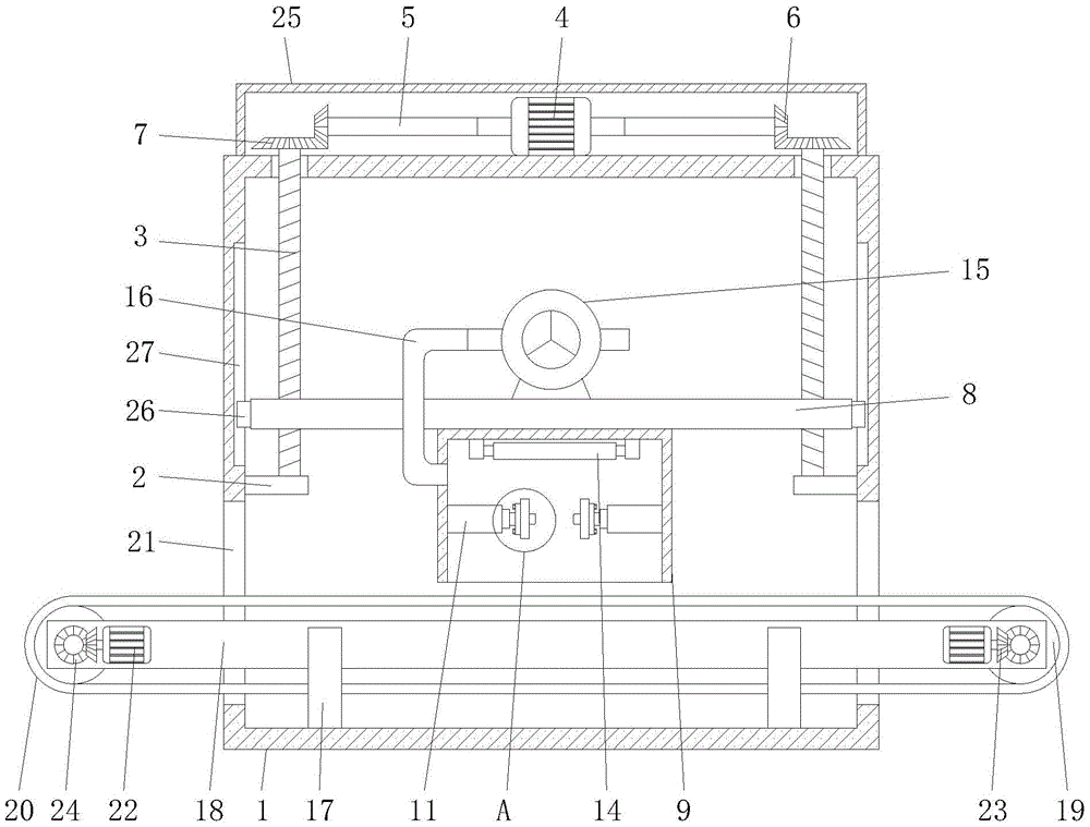 本实用新型公开了一种食品包装用真空包装机,包括箱体,所述箱体内腔的两侧均固定连接有支板,所述支板的顶部活动连接有螺纹杆,所述箱体的顶部固定连接有双轴电机,所述双轴电机的转轴固定连接有转杆,所述转杆远离双轴电机的一端固定连接有第一锥齿轮,所述螺纹杆的顶端贯穿至箱体的顶部并固定连接有第二锥齿轮,所述第一锥齿轮与第二锥齿轮啮合。本实用新型具备包装效率高且具有杀菌功能的优点,解决了现有的食品包装用真空包装机,在使用过程中,由于结构单一,无法在输送过程中对食品进行真空包装,导致影响包装效率,且真空箱内部不具有杀菌功能,从而降低了装置适用性的问题。