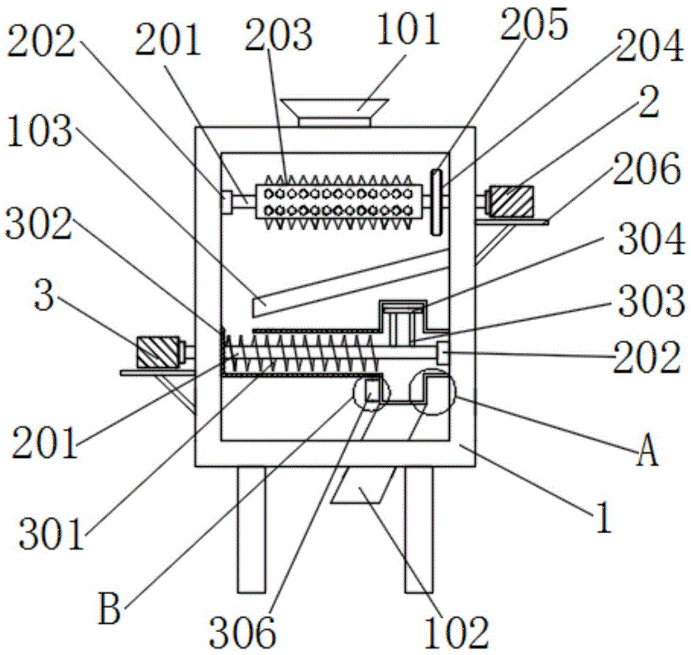 一种陶瓷生产加工用的泥料筛分装置,包括设备主体、第一电机、第二电机,第一电机配套设置于设备主体右侧面顶端处,第二电机配套设置于设备主体左侧面底端处,当需要对泥料进行处理时,启动第一电机,当第一电机运行后,会带动传动杆和传动齿轮进行旋转,在旋转的同时可以对结块的泥料进行破碎处理,当泥料进入至防护罩内部后,启动第二电机,当第二电机运行后,会带动其传动杆和螺旋叶片进行旋转,在旋转的过程中可以将泥料和石块输送至防护罩的右侧处,通过其过滤孔洞的设置,能够让泥料掉落至排料口处,而石块则会被阻隔至防护罩内部,并且由于固定杆和刮板的连接关系,因此可以带动石块进行旋转运动,这样就能够避免石块堵塞过滤孔洞情况。