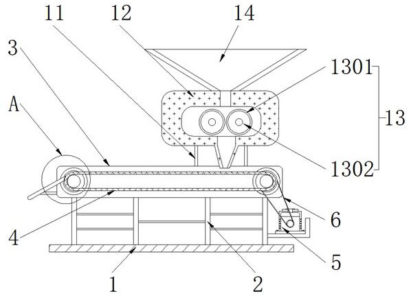 本实用新型公开了一种松子破壳装置,包括:支撑底板,其上端设置有支撑架,且支撑架的上端安装有限位板,并且限位板的内端设置有连接辊,所述连接辊的内侧安装有限位辊,且连接辊的右侧外端安装有第一皮带,并且第一皮带的内端设置有电机组件;输送带,其设置在限位辊的外表面,且输送带的左侧设置有与限位板连接的导向板,所述限位板的上端右侧设置有稳定杆;衔接外壳,其安装在稳定杆的上端,且衔接外壳的内部设置有破壳组件,并且破壳组件的后端外表面安装有第二皮带;漏斗口,其设置在衔接外壳的上端。该松子破壳装置,便于更好的对破壳后的松子进行集中收集,操作便捷,节约了工作时间,同时便于提高工作效率。