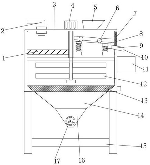 本实用新型涉及固体饮料生产领域,公开了一种固体饮料生产用原料过滤装置。本实用新型中,包括过滤机,所述过滤机的内壁固定安装有支撑板,所述支撑板的上端固定安装有震动弹簧,所述震动弹簧的上端固定安装有筛选板,所述筛选板的上端固定安装有挡板,所述挡板的外端固定安装有震动机,所述过滤机的内壁固定连接有滑槽板,所述滑槽板的内壁滑动连接有过滤板二,所述过滤板二的右端固定安装有把手,所述过滤机的下端固定安装有储料槽,所述储料槽的下端固定安装有出料管,所述出料管的外端转动连接有出料阀门,所述过滤机的表面固定安装有控制面板,该实用可以对原料多次过滤,使生产成型的成品更加干净,提高产品的质量。
