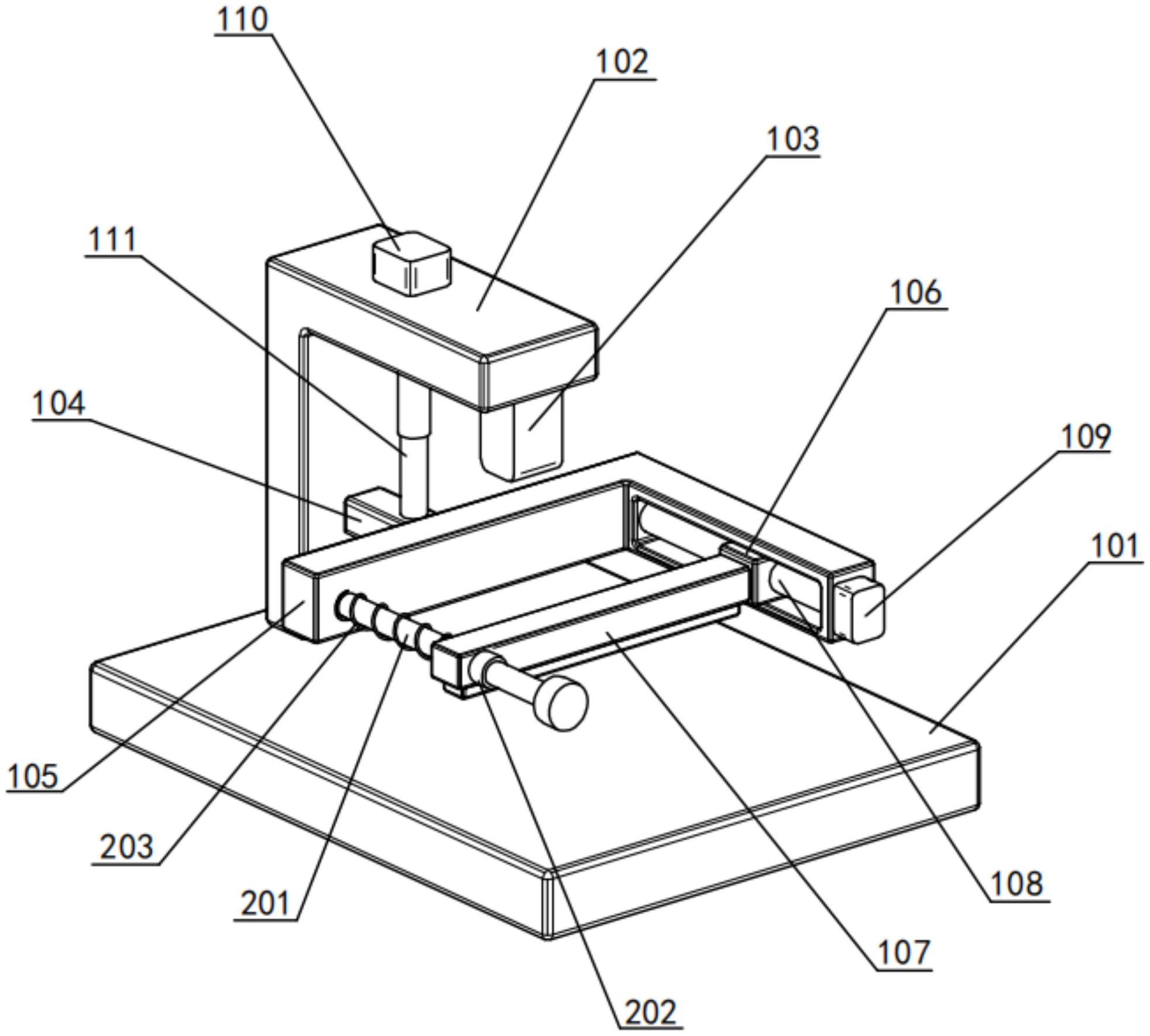 本实用新型涉及采集装置技术领域,具体涉及一种信息采集设备,包括采集平台、支撑架、采集头和压平装置,压平装置包括连接杆、固定压板、移动滑块、移动压板、移动组件和下压组件,连接杆与支撑架滑动连接,固定压板与连接杆固定连接,移动滑块与固定压板滑动连接,移动压板与移动滑块固定连接,移动组件驱动移动滑块滑动,下压组件驱动连接杆滑动,将票据放在采集平台上方,通过下压组件的工作,带动连接杆在支撑架内向下移动,从而使固定压板对票据的一侧边缘进行压紧,进一步通过移动组件的工作,带动移动滑块在固定压板内向右滑动,从而使移动压板匀速向右侧移动,进而对票据进行稳定压平,进一步避免造成票据损坏。
