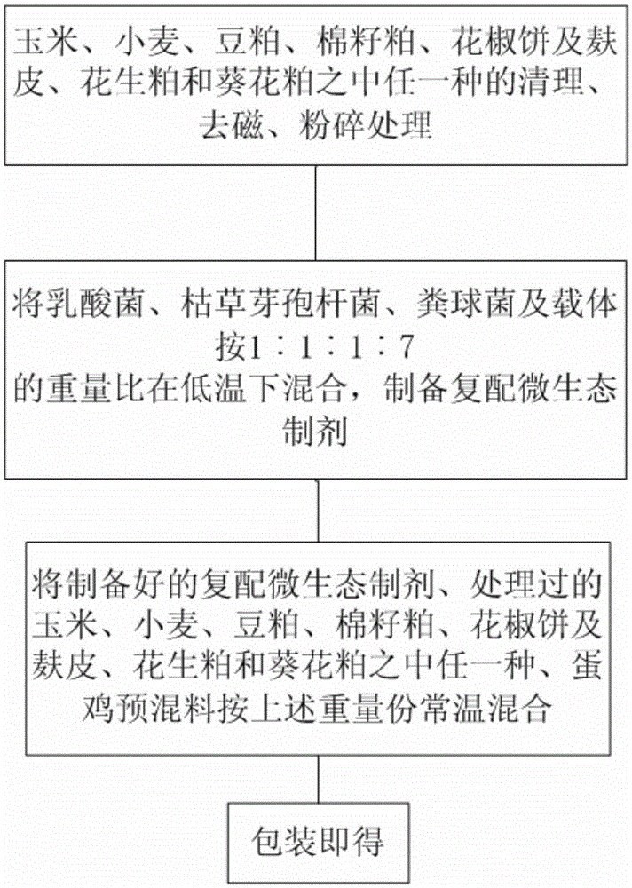 本发明提供一种鸡饲料,由包括下述重量份的物料制成的:玉米50~70份,小麦10~15份,豆粕10~25份,棉籽粕5~15份,花椒饼5~10份,蛋鸡预混料1~5份,复配微生态制剂0.2~0.5份,还包括麸皮、花生粕和葵花粕之中的任一种,份数为5~15份。具有促进蛋鸡肠道健康,减少疾病发生,同时提高饲料利用率,提高蛋鸡生产性能,全期用药少,死淘率低。