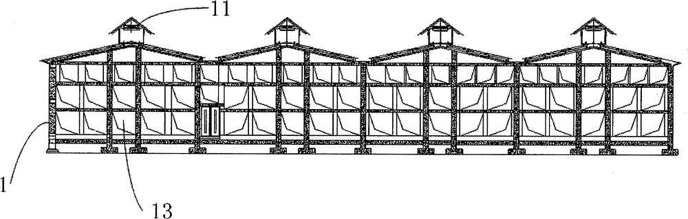 本实用新型提供了一种连体式鸡舍,包括若干单鸡舍,沿所述单鸡舍的纵向依次连接,相邻两个所述单鸡舍之间共用一面墙;所述单鸡舍,位于其纵向的墙体均不设窗口,其顶部设有通风口,位于其横向的墙体上设有门。本实用新型减少了鸡舍外墙与外界环境的接触面积,减少了热量的传导与散失,能够起到保温、隔热的效果;建筑用地少,建造成本低;单鸡舍的纵向尺寸缩短,提高了通风效率。