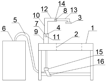 本实用新型涉及一种红枣加工设备,特别涉及一种夹心枣糖液喷淋装置。该夹心枣糖液喷淋装置,包括工作台,其特征是:所述工作台上开设有喷淋盛放孔,喷淋盛放孔上方设有喷淋盘,喷淋盘安装于旋转管上,喷淋盘连接糖液软管,糖液软管与糖液压力罐相连接。本实用新型的有益效果是:可对盆里的夹心枣进行糖液的自动喷淋,喷淋均匀,且不会污染糖液;适用于大小不同的盛枣盆,操作方便,节约成本,保证了夹心枣的外观和成色。