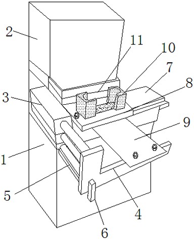 本实用新型公开了一种刀柄半自动成形冲压装置,包括基座、冲床和气缸,所述冲床和气缸位于基座顶部一侧设置,所述气缸输出端安装有输送支架,所述输送支架通过两组对称设置的内六角螺栓与输送片的一端固定连接,所述基座顶部位于气缸一侧设有支撑板,所述支撑板顶部通过内六角螺栓与固定板固定连接,所述输送片在支撑板和固定板之间的凹槽内滑动连接,所述固定板顶部设有模具斗,所述模具斗之间位于固定板上开设有凹槽,所述冲床底部包括上模具和下模具,所述冲床背面底部一侧设有集料槽,本实用新型实现自动送料、冲压,减少人工操作,效率高。具有很高的实用性,保证其使用效果和使用效益,适合广泛推广。