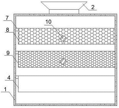 本实用新型是涉及枸杞子生产制造的技术领域,具体是涉及一种枸杞子分级筛选装置,箱体左右两端侧壁的下端分别开设有位置对应的限位槽一,限位槽一内放置有接料框;箱体左右两端侧壁的上端分别开设有两个竖向排列的限位槽二;限位槽二的前后两端分别固定连接有弹簧,限位槽二内的两个弹簧上固定连接有半圆形固定板;转轴的两端固定在固定板上,转轴上转动连接有半圆形挡板;筛网一的两端分别与箱体上端的两个固定板固定连接,筛网二的两端分别与箱体下端的两个固定板固定连接;筛网二与筛网一上都固定连接有震动器,本实用新型具有使用方便、提高筛分效率、制作成本低等优点。