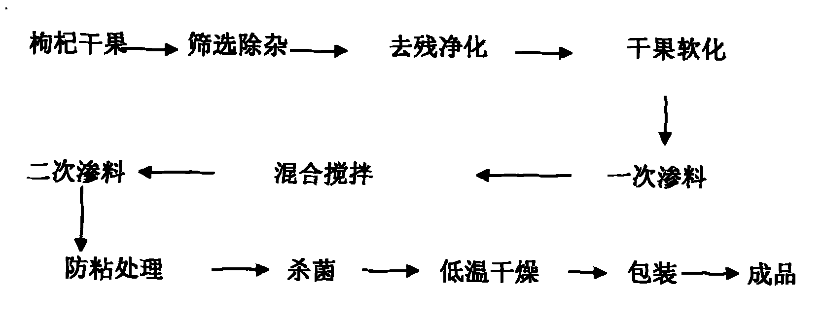 本发明是一种枸杞保健果脯及其生产方法,产品按照成品中含原料的重量份数其构成为:枸杞干果80-95%,果汁2-15%,配伍药材浸汁0.3-5.0%,柠檬酸0.1-3.5%,VC?0.1-1.0%,其余为纯水。工艺过程是枸杞干果经筛选除杂、去残净化、干果软化、药物渗料、混合搅拌、果汁渗料、防粘处理、杀菌、低温干燥得到成品。
