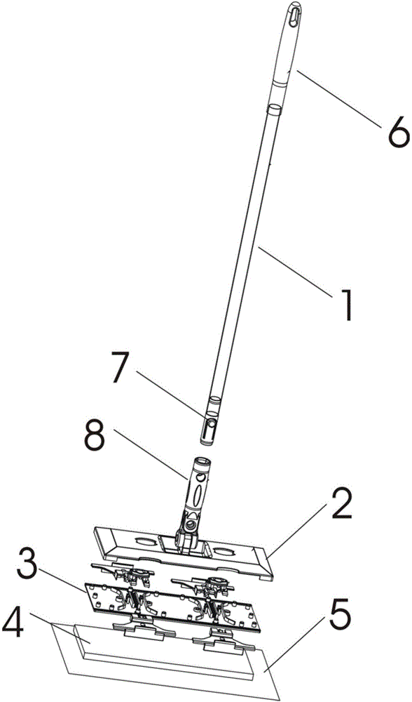 本实用新型公开了一种新型除尘拖把,包括把杆和把头,把头包括面盖板、底板、EVA垫板和除尘纸,把杆通过万向连接结构连接把头的中部,底板上表面设置有夹纸装置以及上表面边缘处设置有多组卡柱,并且通过卡柱连接在面盖板的下表面,EVA垫板粘接在底板的底面,除尘纸紧贴EVA垫板的下表面并通过夹纸装置夹持在把头上,面盖板上位于万向连接结构两侧设置有与夹纸装置对应的通孔。该种新型除尘拖把通过设置两级夹紧力度,对于不同厚度的除尘纸和抹布具有兼容性,使用方便,更换除尘纸和抹布用手捏紧两侧的纸夹,夹住除尘纸或抹布后进行拖地,按下按扣,纸夹弹开,操作十分方便便捷,无需拆卸把头,省时省力。