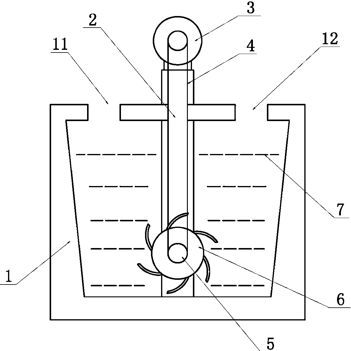 一种浸覆浆搅拌装置,包括浸覆浆槽、固定架、调速电机、传动链条、带芯调节导辊和搅拌器,其特征是所述的固定架包括主架和侧架,主架通过焊接的方式与浸覆浆槽的底部相连接,侧架与浸覆浆槽形成带芯入口和带芯出口,所述的调速电机设置在固定架的上部,所述的带芯调节导辊设置在固定架的下部,所述的搅拌器设置在带芯调节导辊的端部,搅拌器通过传动链条与调速电机相连接;浸覆浆粘度基本保持一致,成分更加均匀,浸浆效果更好。