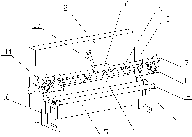 一种输送带胚边胶裁切装置,包括设置在硫化机的出料口处的带体支撑装置,带体支撑装置的上方设置一与硫化机的前壁板相铰接的裁剪机构,裁剪机构包括切刀架和驱动块,驱动块的两端各设置一摆臂,摆臂与驱动块之间连接有丝杠和导向杆,切刀架挂接在丝杠和导向杆上,驱动电机与圆盘切刀之间连接有减速机,驱动电机的安装板上对应固接有与导向杆相配合的导向套,以及与丝杠配合的螺母套,切刀架通过螺母套沿丝杠左右移动,摆臂的外侧设置有驱动丝杠转动的把手,气缸的一端与驱动块相铰接,气缸的另一端与硫化机的前壁板相铰接。本实用新型自动化程度高,实用性强,克服了现有固定条形刀片通过拉动带胚以裁剪胚边存在阻力大的问题和不足。