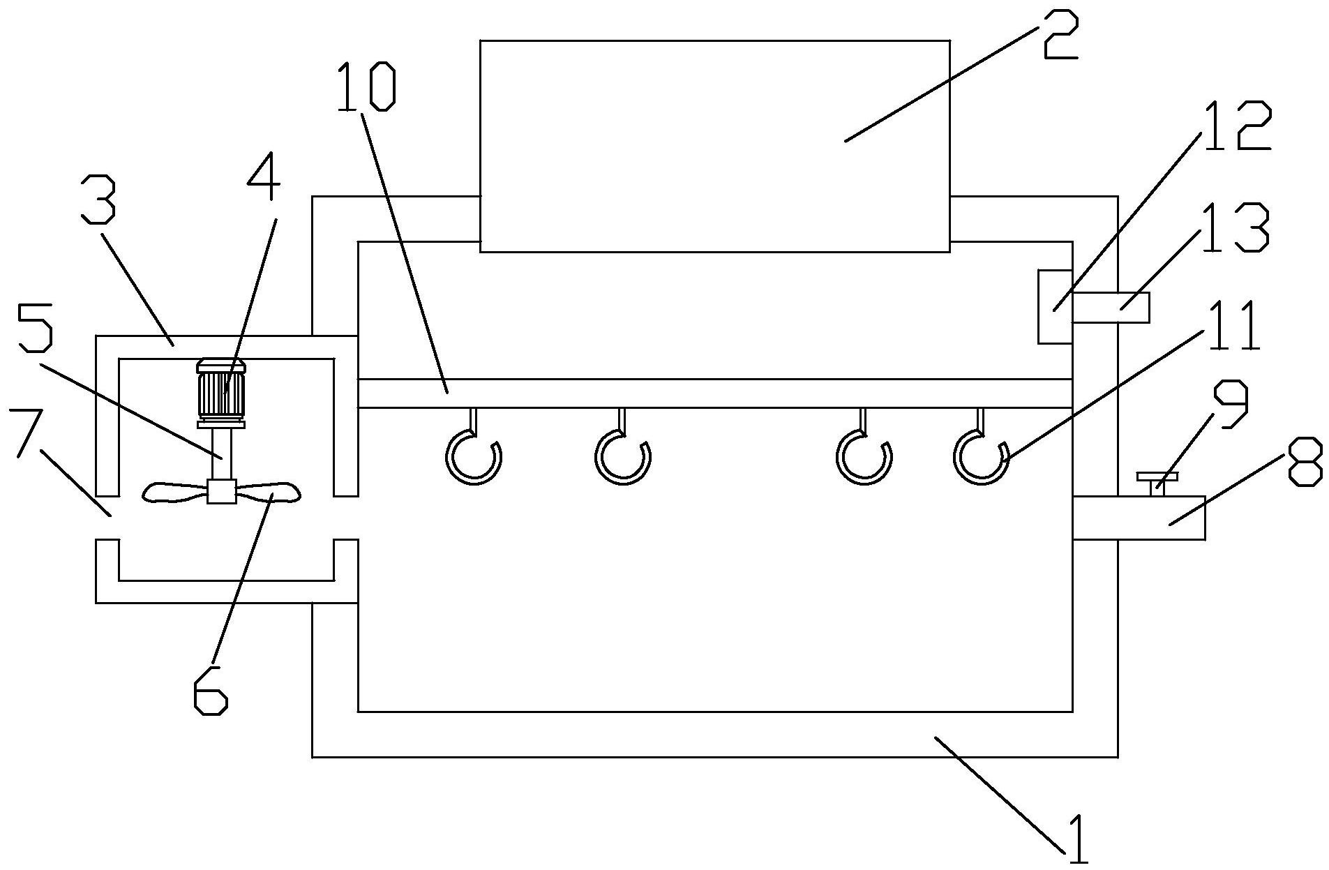 本实用新型公开了一种新型火腿发酵装置,包括发酵室、设置在发酵室上端的加热装置和设置在发酵室侧壁上的换气净化箱,所述发酵室内固定连接有挂杆,所述挂杆上可拆卸连接有若干阵列分布的挂钩,所述挂杆靠近挂钩的一端开设有供挂钩插入的若干内腔,所述挂钩靠近挂杆的一端对称设置有两个第一连接块,所述内腔的侧壁上开设有供第一连接块滑动的滑槽,所述内腔的底壁上开设有供第一连接块转入的环形槽。本实用新型的一种新型火腿发酵装置,能够方便调节相邻火腿之间的距离,防止火腿站在一起而影响发酵的质量。