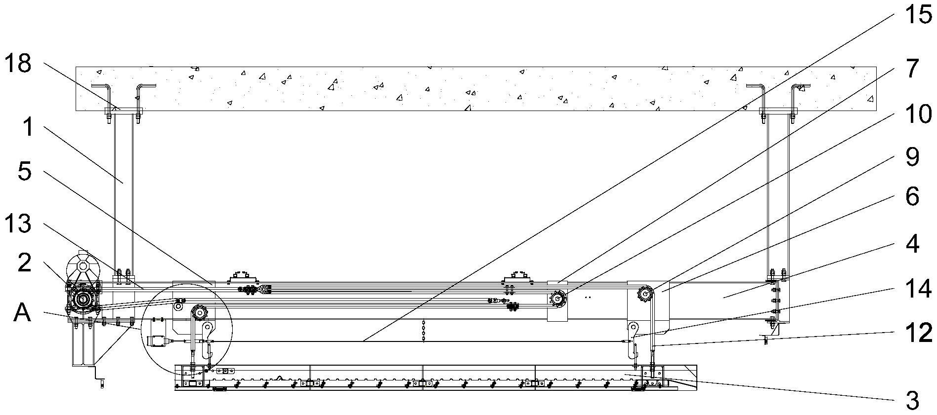 本实用新型公开了一种吊挂式双层升降停车设备,属于车辆停放设备技术领域,包括吊杆、驱动机构和台板,且设有第一拉绳和第二拉绳,通过驱动机构对第三拉绳进行拉动,进而便于对第一拉绳和第二拉绳进行同步拉紧和松弛,进而便于台板进行升降,使得台板上的车辆便于进行吊起,便于在台板的下侧存放第二辆车辆,且本实用新型通过采用吊装,使得台板下端无立柱,对于第二辆车辆进行进出时更加的容易,同时在台板的下侧可停中大型车辆,对车位上方的空间进行合理的应用,适用于建造在地下室中,降低用户对于存放两轮车的成本,且设有吊钩和吊环,在进行停放时,提高台板存放时的稳定性和安全性,便于使用。