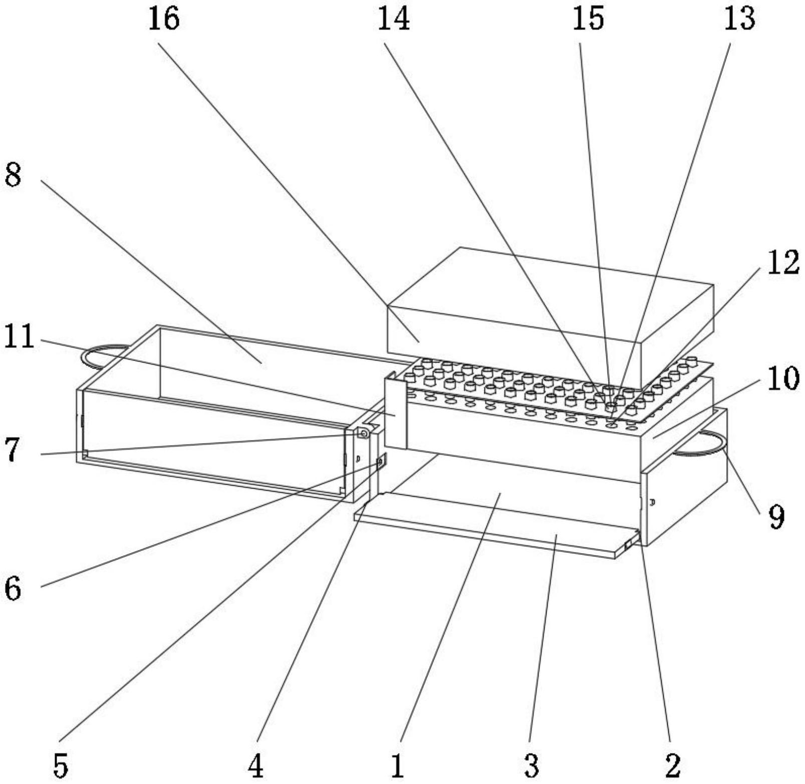 本实用新型属于生物医学领域,具体为一种96深孔板样品转移器,其特征在于:包括转移器第一外框,所述转移器第一外框的边侧设置有第一转动轴,且第一转动轴的边侧连接有活动板,并且活动板的边侧设置有卡块,所述转移器第一外框的边侧开设有卡槽,且卡槽的边侧嵌套有圆柱按钮,所述转移器第一外框的外壁嵌套有第二转动轴,且第二转动轴的边侧连接有转移器第二外框,并且转移器第一外框的外壁一侧设置有手柄,所述转移器第一外框的顶部一次向上排列有采样盒、转移板、存样盒,且采样盒的直角边侧连接有定位辅助架;本实用新型便于对转移完毕的装置进行取出,便于样品转移操作是对样品的保护,便于快速的转移样品,减少时间,提高工作效率。