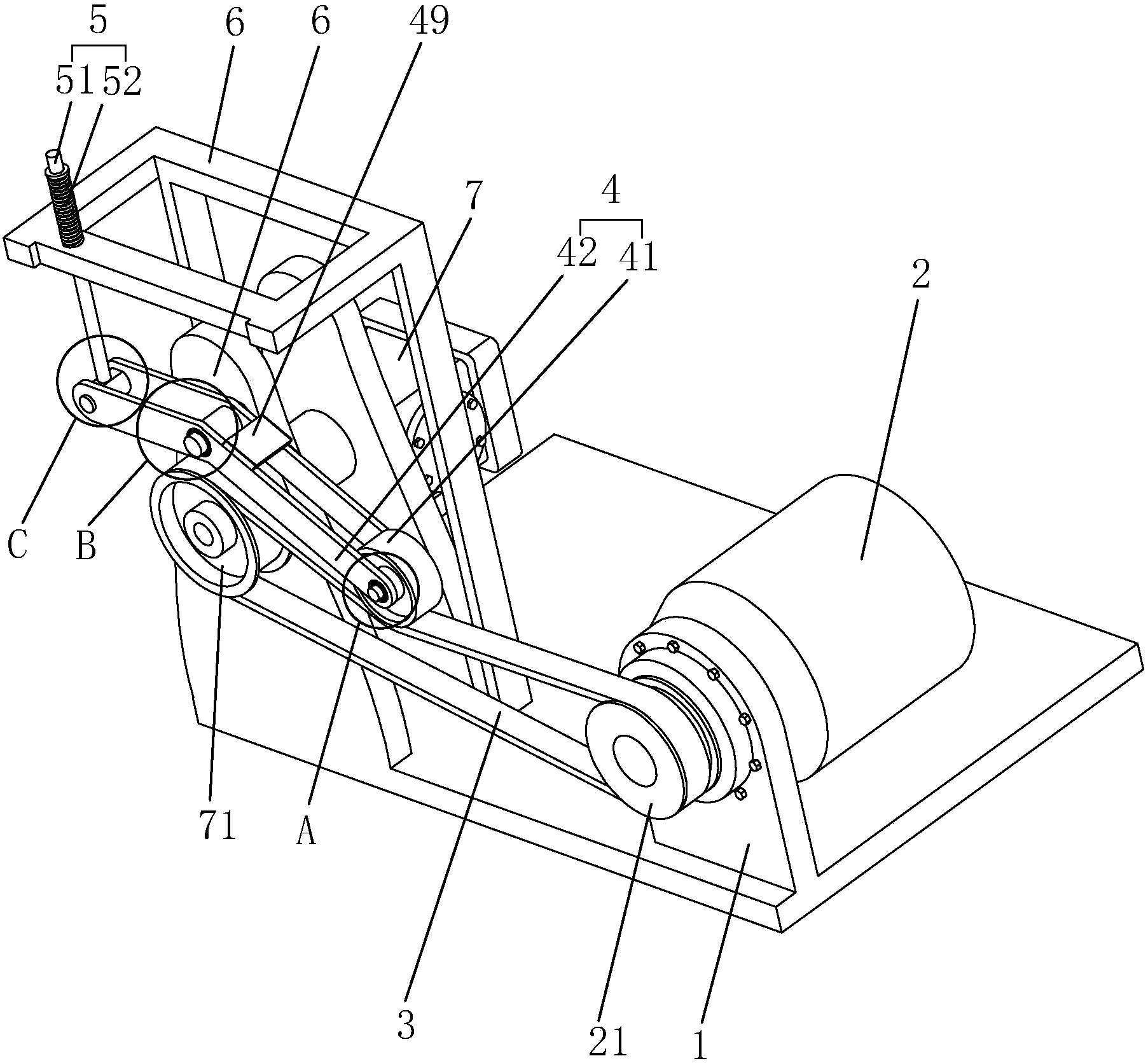 本实用新型公开了一种收获机皮带张紧装置,属于农用机械领域,其技术方案如下,包括发动机、皮带、液压油泵,所述发动机上转动连接有主动轮,所述液压油泵上转动连接有从动轮,所述皮带套接在主动轮与从动轮上,所述液压油泵上固连有泵架,所述泵架上设有张紧机构,所述张紧机构包括张紧轮、张紧架,所述张紧架为厂字形钢板,所述张紧架弯折端与泵架转动连接,所述张紧轮转动连接在张紧架一端且与皮带外圈端面抵接,所述张紧架另一端铰接有调节机构,所述调节机构使张紧轮向皮带内侧移动,具有传动稳定且动力损失较小的优点。