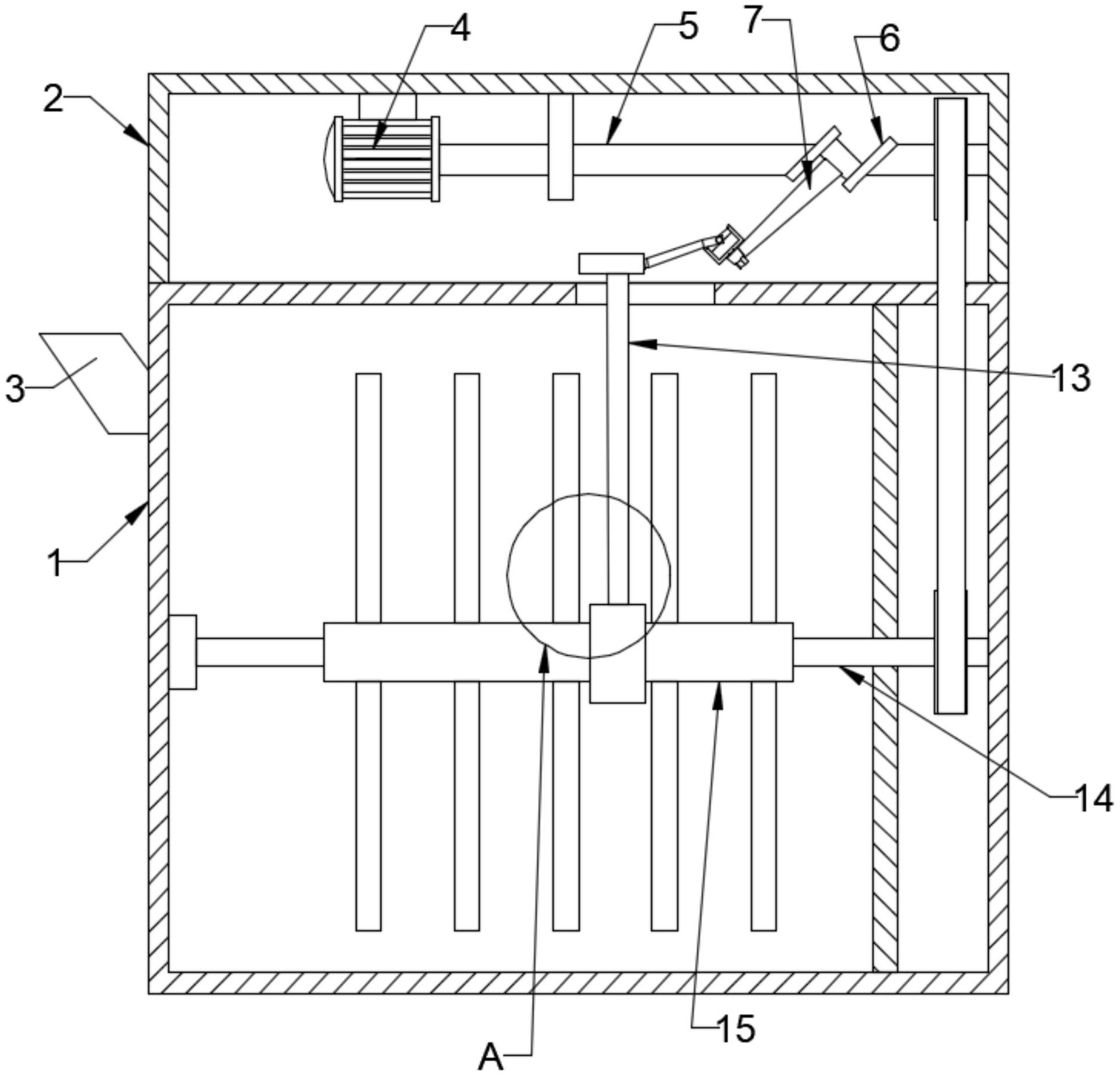 本实用新型适用于药品生产技术领域,提供了一种用于药品制剂生产的原料混合装置,包括搅拌箱,所述搅拌箱的顶部设置有驱动箱,所述搅拌箱上还设置有进料口,还包括:驱动机构,所述驱动包括电机,所述电机的输出端连接有驱动轴,所述驱动轴传动连接有从动轴,所述驱动轴上还设置有往复组件;搅拌组件,所述搅拌组件包括滑动安装于从动轴上的搅拌件,所述搅拌件上套设有连接轴承,所述连接轴承侧壁外部连接有传动杆,且所述传动杆与往复组件连接。该装置可对搅拌箱内部的药品原料进行搅拌混合的同时进行往复翻料,搅拌混合效率高,使用效果好。