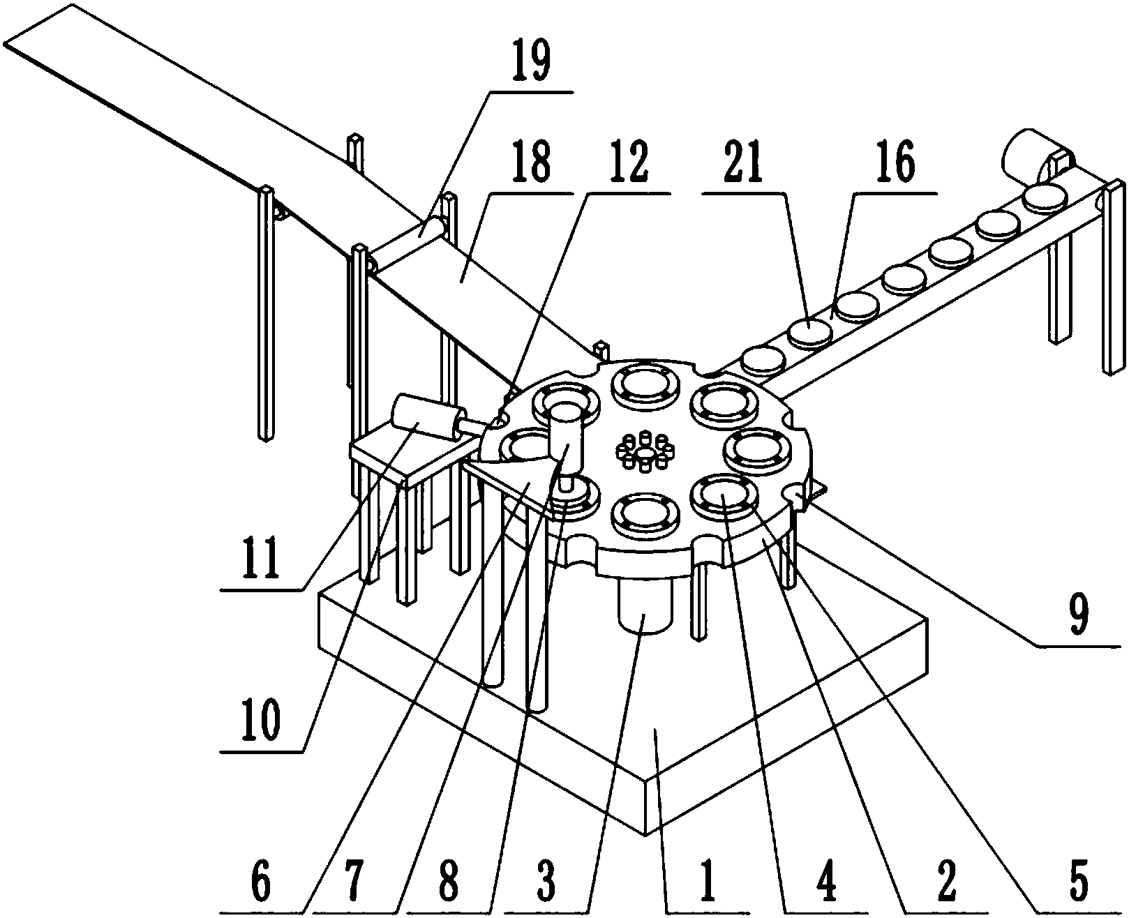 本实用新型是一种新型的旋转式自动包装机,包括底座和旋转包装盘,旋转包装盘底部连有旋转轴,旋转轴连有旋转电机,旋转包装盘上贯穿有多个包装孔,包装孔内套有环形加热套,底座上设有落料气缸支架及落料气缸,落料气缸连有落料板,旋转包装盘的边缘均布有多个卡槽,底座上设有卡位气缸支架及卡位气缸,卡位气缸连有卡块,旋转包装盘下方设有包装盒支座,包装盒支座上贯穿有孔洞,孔洞下方设有顶板,顶板下方连有上顶气缸,包装盒支座一侧连有包装盒输送装置,包装盒支座上方设有环形割刀和条状的塑料包装带,塑料包装袋连接有传动轴装置,环形割刀连有升降装置。本实用新型大大的提高了劳动生产率,能有效地保证包装质量,包装规格化、标准化。