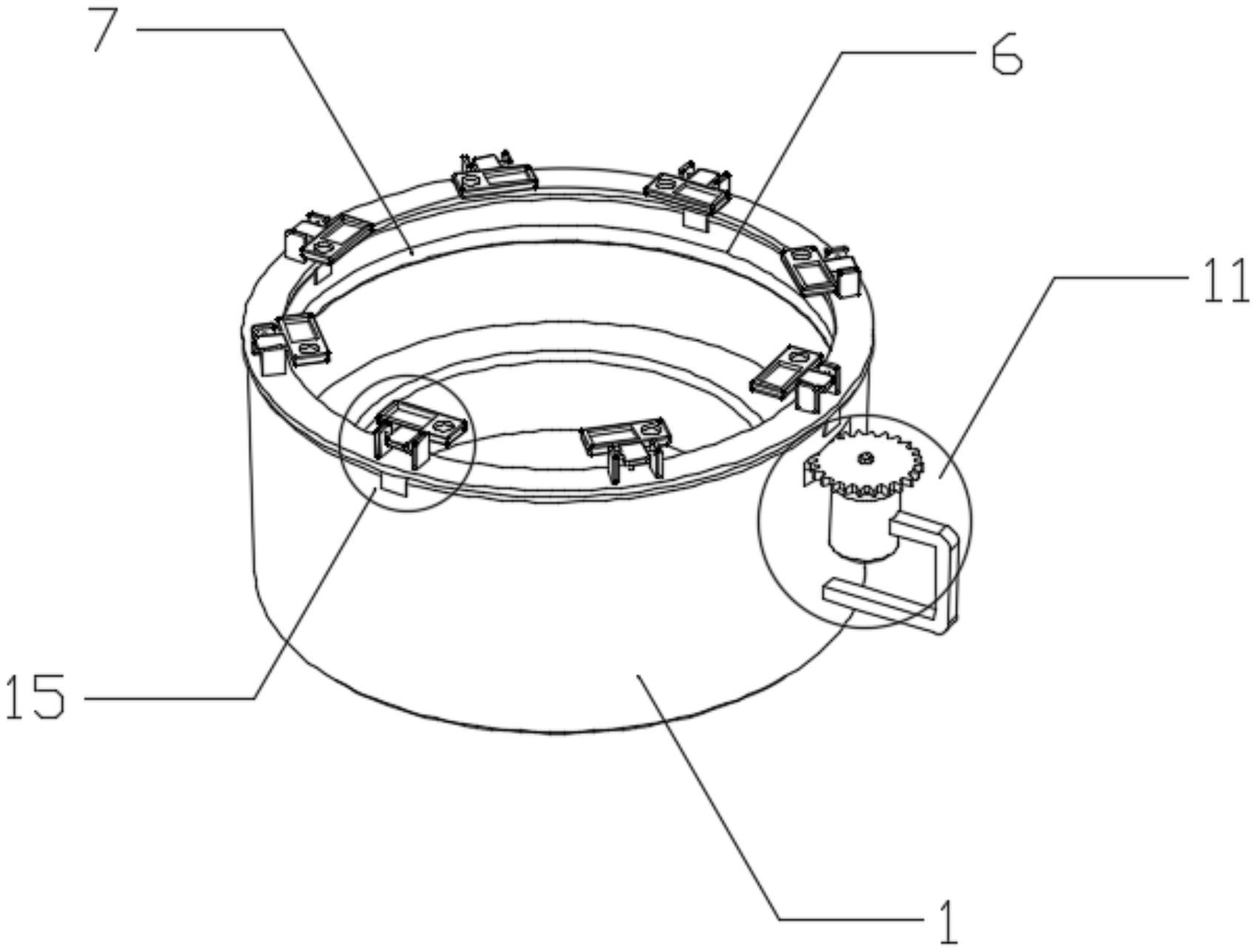 本实用新型公开了一种带自清洁功能的温泉池,涉及温泉技术领域,包括池体,池体内部的底端固定设有支撑台,池体内壁的顶部开设有转动槽,转动槽的内部转动连接有转动环,转动环的内侧设有清理结构,池体一侧的顶部设有驱动组件,池体的顶端开设有滑槽,滑槽的表面滑动连接有四个滑块,四个滑块的顶端固定设有环形的支撑板,支撑板的顶端设有放置组件,本实用新型的有益效果是:通过设置的驱动组件能够带动转动环进行转动,从而带动三个清理板进行转动,通过三个清理板表面的清理刷毛对池体的内壁进行清理;通过设置的放置组件便于放置洗浴用品,并且支撑板转转动设置,不需要洗浴人员来回走动拿取洗浴用品,节约时间。