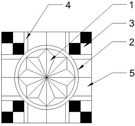 本实用新型提供一种强化拼花地板,它包括有不同花色的小三角形、外环、正方块;其中,若干个小三角形拼接形成中心八角星形,八角星形顶点外接有外环,外环与八角形之间的间隙处地板外表面低于八角星形与外环的外表面;外环的四个45°对角处各设一组方块,方块外侧拼接有长方框条,相邻长方框条之间通过两块异形块分隔;拼接地板的所有部件侧边均设有连接位,其中两条边的连接位为凹槽,另两条为相配合的凸条,所述的连接位的顶面和侧面为直线,底部呈弧状。本方案的优点在于拼接方便,拼接后具有较强的凹凸立体感。制作过程简单、环保,其应用前景广阔。