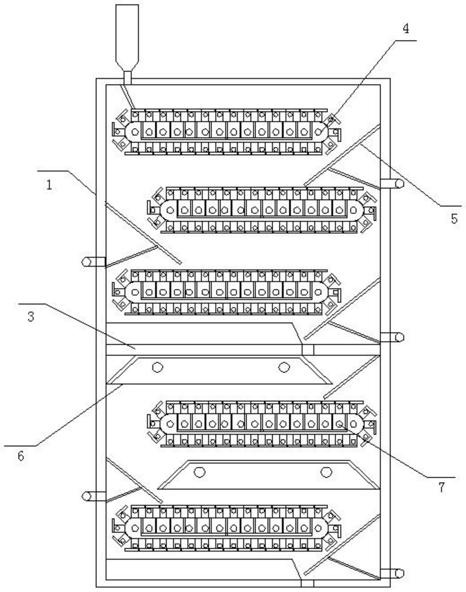 本发明属于食品技术领域,尤其是一种能调理血脂血糖血压的保健食品及其制备方法,现提出如下方案,一种能调理血脂血糖血压的保健食品制备装置,包括干燥箱,所述干燥箱的内部安装有两组沿竖直方向设置的侧挡板,两组所述侧挡板之间固接有沿水平方向设置的隔板,所述隔板的顶部安装有由上至下交错分布的冷却机构;还包括一种能调理血脂血糖血压的保健食品的制备方法和一种能调理血脂血糖血压的保健食品。本发明调理机体,提高身体的代写功能,提高身体的活性,改善调理身体的血脂血糖血压的指标,在制备的过程中实现颗粒的连续低温干燥操作,有效保证食品活性,提高食品的制备效率,提高经济效益。
