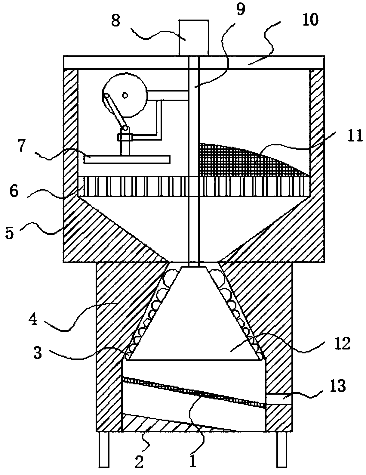 本实用新型属于研磨装置领域,尤其是一种用于提取葡萄抗氧化物质的研磨装置,现提出如下方案,其包括壳体和基体,基体上开有下料通道,所述壳体的底端安装有基体,基体的底端安装有支撑架,壳体的顶端开口处安装有横杆,横杆的顶端中间位置安装有电动机一,电动机一的输出轴连接有转动连接在壳体内的转轴,壳体的内部安装有筛盘,转轴的侧壁上安装有刮料板和对筛盘上物料进行破碎的破碎机构,刮料板与筛盘的顶壁滑动连接,转轴的底端连接有转动连接在下料通道顶端的研磨块,研磨块的侧壁上设有研磨凸起。本装置能够实现对物料的二次粉碎研磨,加工效果好。