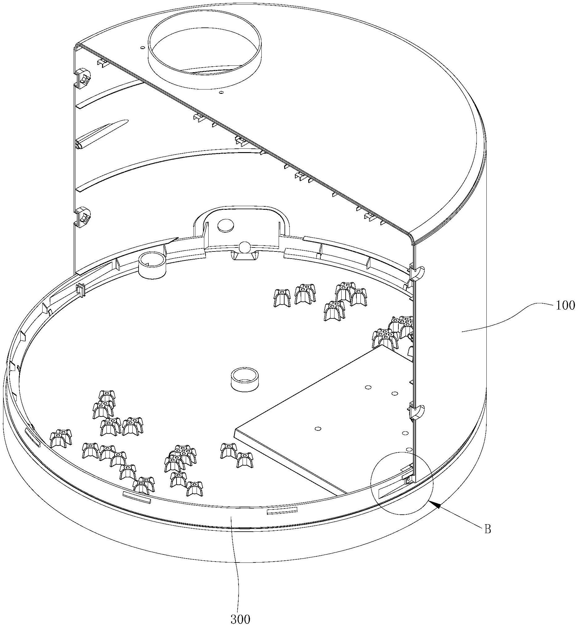 本实用新型公开了一种外壳以及空气能热水器,包括第一壳体、第二壳体以及底盖,第一壳体的内侧壁固设有第一卡接结构,第二壳体的内侧壁固设有第二卡接结构,第一壳体或第二壳体设有固定结构;底盖的外侧的周向依次设有多个第三卡接结构、第四卡接结构以及多个第五卡接结构底盖的外侧的周向设有导向槽,固定结构滑动卡接于导向槽中,固定结构上开设有用于通过螺钉的过孔,导向槽设有螺钉孔。通过固定结构滑动卡接入导向槽中并通过螺钉穿过固定结构的过孔与螺钉孔螺纹连接,并且通过多组卡接结构的配合卡接,相互配合限制了壳体、底盖安装的八个方向的自由度,实现了外壳的完全定位、稳固安装,具有结构简单,拆装便捷等优点。