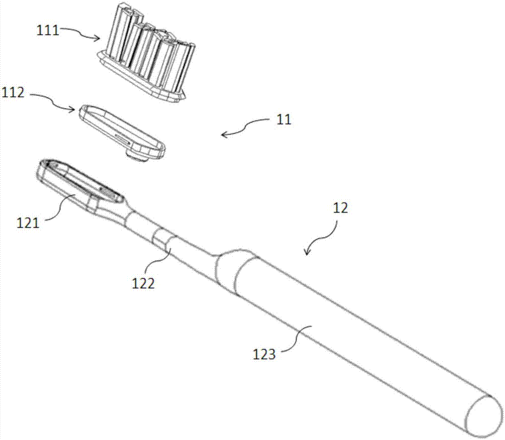 本实用新型涉及一种可更换刷头的牙刷,包括刷柄和固定连接于刷柄的一端的刷头,刷头包括固定连接的刷头本体和刷头护套,刷头本体包括刷毛和刷头头片,刷毛排列固定于刷头头片上;刷头护套包括底板、翻边和凸柱,翻边围绕着底板的周缘固定并与刷头头片连接,凸柱从底板的底面凸出;翻边的外表面上设置有卡位结构;刷柄包括底托和罩部,罩部围绕着底托的周缘固定,罩部的内表面上设置有卡槽结构,卡槽结构与翻边的卡位结构配合,底托具有贯通孔,刷头护套的凸柱从贯通孔中伸出。本实用新型的刷头与刷柄可以进行拆卸,从而根据使用的情况对刷头进行及时的更换,由此避免整体更换所造成的浪费和环境污染。