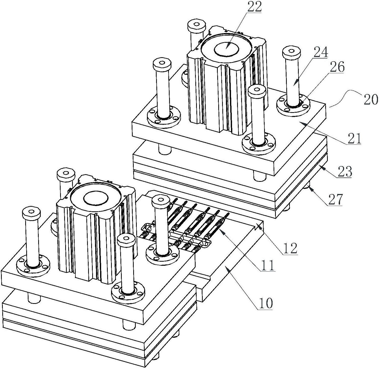 一种牙间刷自动插刷毛装置,包括牙间刷定位模具和插接装置,所述牙间刷定位模具为矩形块状,其上表面设有等间距布置的定位凹槽,所述定位凹槽形状与牙间刷形状相同,牙间刷安装在定位凹槽中,牙间刷头部位于定位凹槽两端,插接装置位于牙间刷定位模具外部两侧,且分别位于牙间刷头部外侧,所述插接装置包括上托板、气缸、下托板、伸缩杆和吸盘,所述上托板为矩形板,气缸安装在上托板上表面中心,上托板四周设有导向孔,伸缩杆与导向孔配合,下托板平行位于上托板下方,伸缩杆底端与下托板上方连接,下托板底部安装有等间距行排列的吸盘,可同步完成多组牙间刷的插刷毛工序,省时省力,大大提高了牙间刷的插刷毛效率。