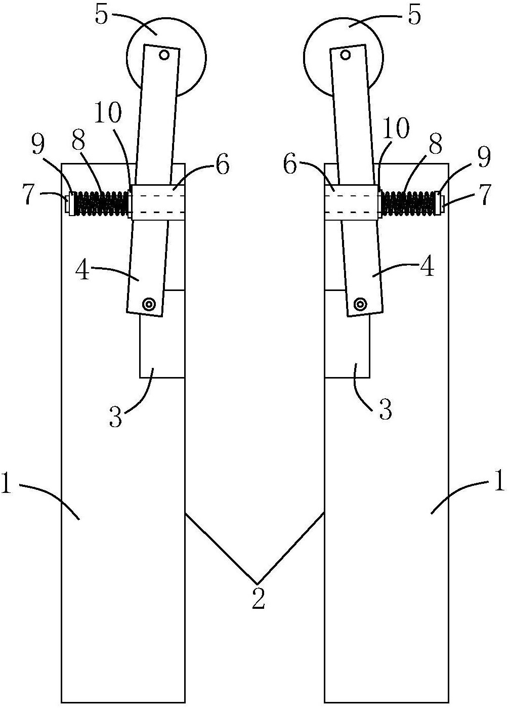 本实用新型提供了一种饼干包装机用插角装置,包括两个相对设置的料道组件,料道组件包括水平设置的料道底板和垂直连接在料道底板侧边上的料道竖板,料道竖板的内侧面上设置有插角组件;插角组件包括固定在料道竖板内侧面的固定块,固定块的前部倾斜地铰连接有摆动件,摆动件的中部连接有弹性复位结构,摆动件的前部连接有插角轮;摆动件能在弹性复位结构上摆动并压缩弹簧。利用插角组件上的插角轮将原本外伸的包装袋的边角向内“插折”,使得包装袋边角不外伸,包装袋整体形状呈规则的长方体,在包装袋后续装盒时更加容易,且占用盒内空间小。