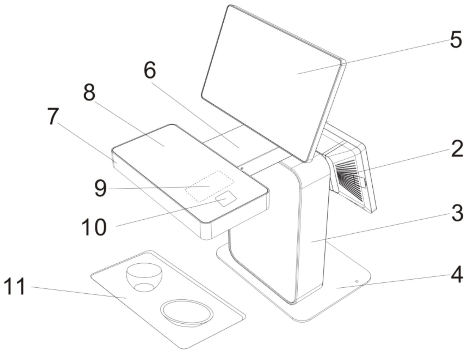 本实用新型公开了一种配合手机识别的AI收银机,涉及AI收银领域,包括底板,所述底板的上表面固定连接有主支架,所述主支架顶端的一侧通过安装支架固定连接有扫描台,所述扫描台的顶端开设有贯穿其底端的手机槽,所述手机槽的内壁间卡接有手机,所述扫描台的上表面位于手机槽的一侧分别固定连接有刷卡器、二维码扫描器,所述扫描台的上表面设置有玻璃盖板,所述主支架的内部固定连接有主板,所述主板分别与刷卡器、二维码扫描器电连接,所述手机与主板通过无线网络连接。该配合手机识别的AI收银机,实现了在不需要额外添加摄像头的同时对菜品进行扫描拍摄。