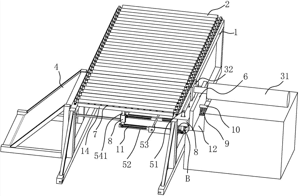 本实用新型公开了一种农产品自动分拣设备,其技术方案要点是包括输送架、辊轴、推送器和分拣出口,辊轴转动连接于输送架,推送器固定安装于输送架一侧,推送器包括气缸和推块,推块固定安装于气缸的轴上,分拣出口固定安装于推送器对侧;输送架下方设有升降机构,农产品到达分拣出口后,推块触发升降机构使升降机构上的托板托起农产品,输送架上的锁块锁定升降机构的状态,托板上的滚动体让推块更容易将农产品推向分拣出口,减少了因农产品和辊轴之间的摩擦力过大而致使农产品翻倒的情况;将农产品推向分拣出口后,推块往回运动,推块与锁块抵接并推动锁块,这时锁块解锁升降机构的状态,在重力作用下托板回到初始位置,为下一次分拣做准备。