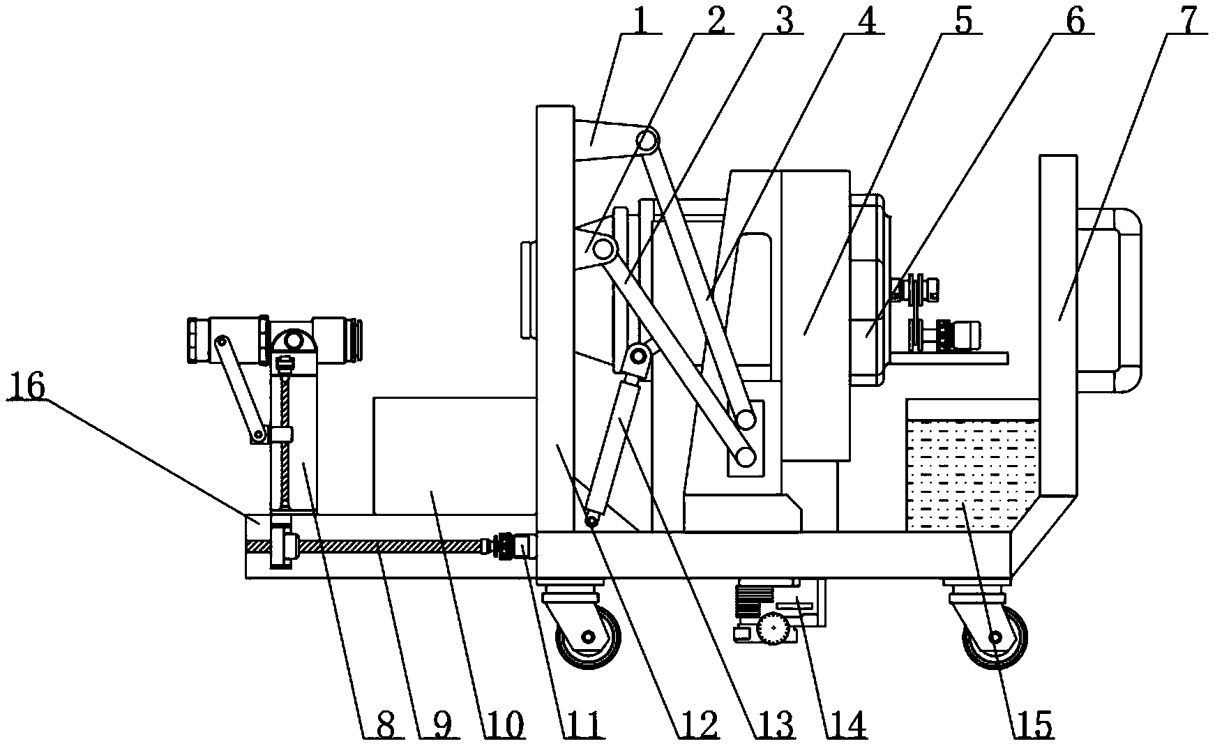 本实用新型涉及食品加工技术领域,尤其为一种可倾式自动滚揉机用调节工装,包括固定套、滚揉机本体、车体和立柱,所述车体上方的左侧位置上安装有安装架,所述安装架上方的前后两侧对称那装有上铰链座,所述安装架的右侧位置上设置有固定套,两个所述上铰链座通过第二传动杆分别与固定套之间铰接,所述固定套横向安装有滚揉机本体,所述滚揉机本体的左下方位置上设置有导轨,所述导轨横向安装在车体的左下方位置上,所述导轨上纵向设置有立柱,所述立柱的上端设置有喷头;本实用新型提高了装置的自动化水平,增加了装置的自主下料功能,实现了装置的自清洁功能。