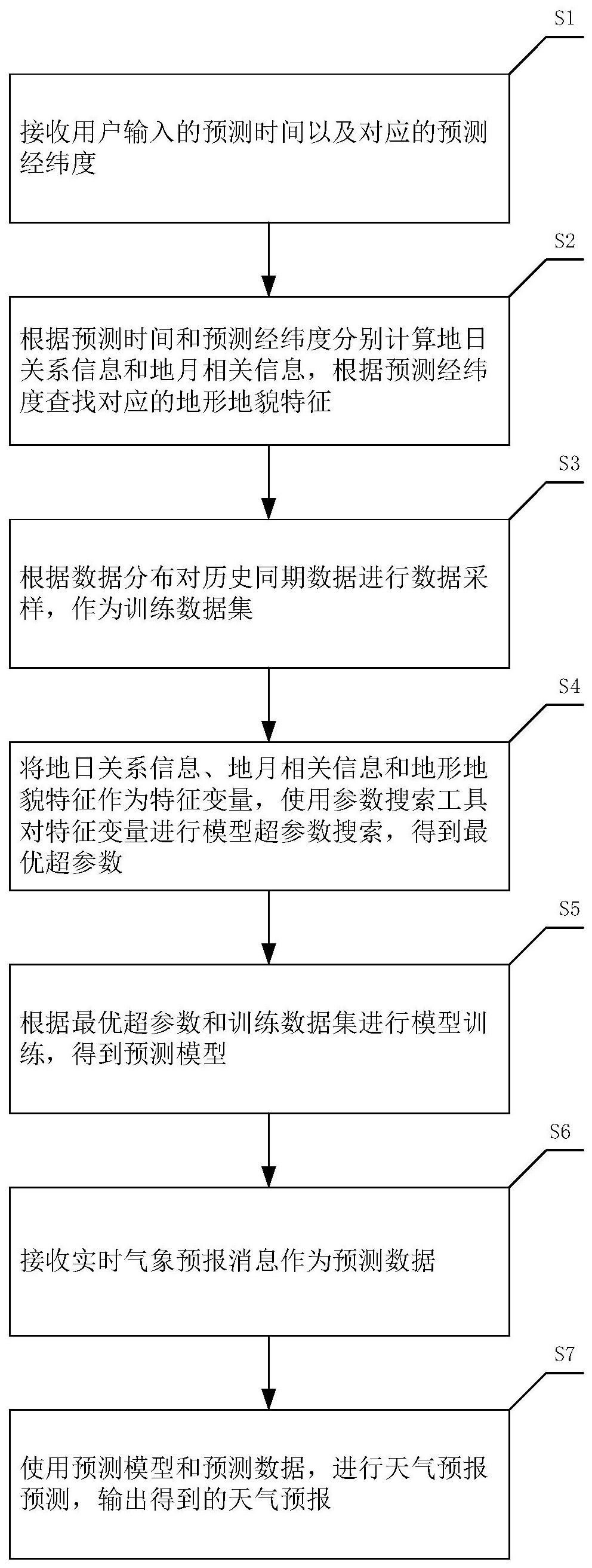 本发明公开了一种天气预报方法、装置、计算机设备及存储介质,属于天气预测技术领域,方法包括,接收用户输入的预测时间和预测经纬度,根据预测时间和预测经纬度计算地日关系信息和地月相关信息;根据预测经纬度查找对应的地形地貌特征;根据数据分布进行数据采样作为模型的训练数据集;将所述地日关系信息、地月相关信息和所述地形地貌特征引入天气预报模型作为特征变量;使用参数搜索工具对所述特征变量进行模型超参数搜索,得到最优超参数;根据所述最优超参数和所述训练数据集进行模型训练,得到预测模型;接收实时气象预报消息作为预测数据;使用所述预测模型和所述预测数据,进行天气预报预测。