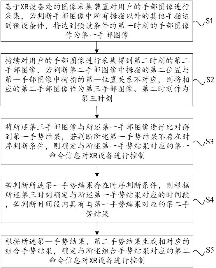 本发明提供一种基于拇指的手势控制方法及系统,包括:对用户的手部图像进行采集,若判断手部图像中所有拇指以外的其他手指达到预设条件,将达到预设条件的第一时刻的手部图像作为第一手部图像;若判断第二手部图像中拇指的第二位置与第一手部图像中拇指的第一位置关系不对应,则将相应的第二手部图像作为第三手部图像、第二时刻作为第三时刻;若判断第一手势结果不存在时序判断条件,则确定与第一手势结果对应的第一命令信息对XR设备进行控制;根据第三时刻确定与所述第一手势结果对应的时间段,若判断时间段内具有与第一手势结果对应的第二手势结果;生成相对应的组合手势结果,确定与组合手势结果对应的第二命令信息对XR设备进行控制。