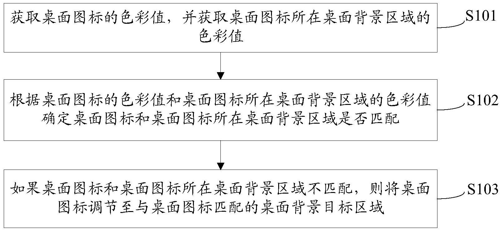 本公开是关于一种对桌面图标的位置进行调节的方法及装置。该方法包括:获取桌面图标以及所在桌面背景区域的色彩值;根据桌面图标的色彩值和所在桌面背景区域的色彩值确定桌面图标和所在桌面背景区域是否匹配;如果不匹配,则将桌面图标调节至匹配的桌面背景目标区域。本公开通过根据桌面图标的色彩值和所在桌面背景区域的色彩值确定桌面图标和所在桌面背景区域是否匹配,并在不匹配的情况下将桌面图标调节至与桌面图标匹配的桌面背景目标区域,确保对桌面图标的位置进行调节是结合桌面图标和其所在桌面背景区域的色彩进行调节的,调节方法更具灵活性和智能性的同时,能够保证调节后的桌面图标与所在桌面背景区域匹配,调节效果更加美观。